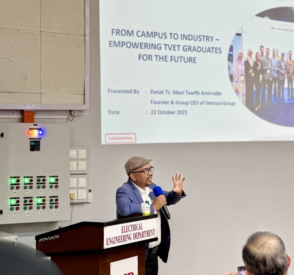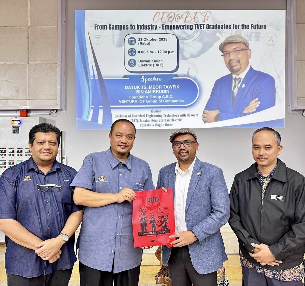 Ipoh, 22 October 2025 – As part of Ventura IoT’s ongoing commitment to developing future-ready talent, YBhg. Datuk Ts. Meor Tawfik Bin Amirrudin, Founder & Group Chief Executive Officer of Ventura IoT Group of Companies, was invited to deliver an inspiring session at Politeknik Ungku Omar (PUO) under the Industry Expert Enrichment Programme (IEEP).