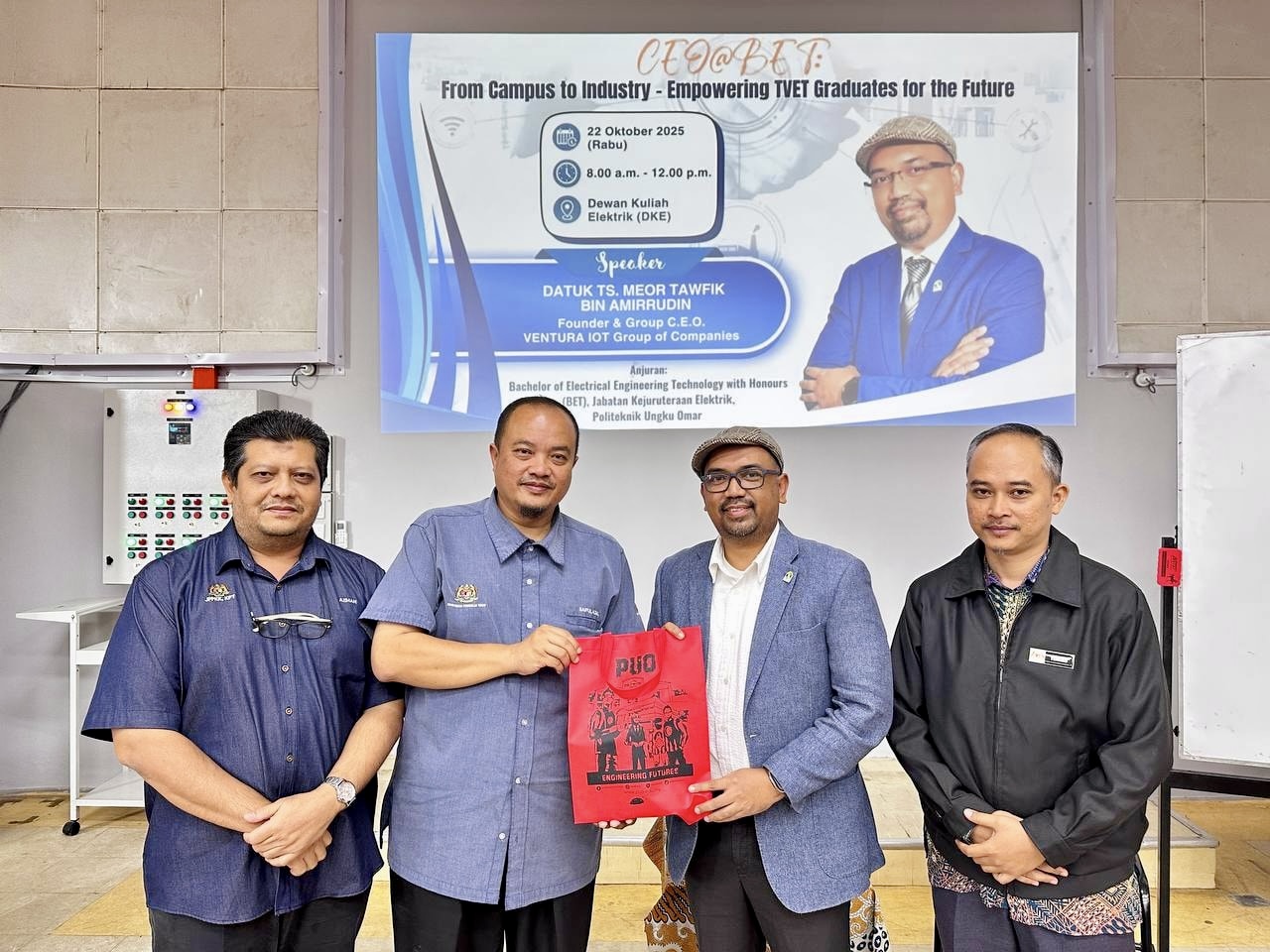 Ipoh, 22 October 2025 – As part of Ventura IoT’s ongoing commitment to developing future-ready talent, YBhg. Datuk Ts. Meor Tawfik Bin Amirrudin, Founder & Group Chief Executive Officer of Ventura IoT Group of Companies, was invited to deliver an inspiring session at Politeknik Ungku Omar (PUO) under the Industry Expert Enrichment Programme (IEEP).